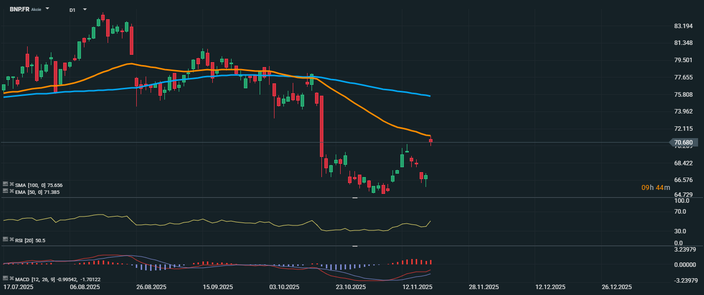 Akcie banky BNP Paribas se aktuálně obchodují na úrovni 70,68 EUR, přičemž se v posledních dnech pokoušely o odraz ze dna, ale narazily na rezistenci v oblasti EMA 50 (71,39 EUR). Cena je stále výrazně pod SMA 100 (75,66 EUR), což potvrzuje přetrvávající medvědí technické nastavení. RSI se aktuálně nachází na neutrální hodnotě 50,5, což ukazuje na vyrovnaný tržní sentiment bez známek překoupenosti nebo přeprodanosti.