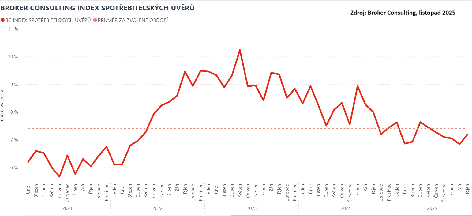 Po období pozvolného poklesu, které trvalo od dubna až do září, došlo v říjnu k mírnému zvýšení průměrné úrokové sazby spotřebitelských úvěrů. Broker Consulting Index spotřebitelských úvěrů dosáhl hodnoty 7,19 procenta, zatímco v září činila sazba 6,84 procenta. Nárůst o 0,35 procentního bodu však odpovídá typickým měsíčním výkyvům, které jsou pro oblast bezúčelových půjček běžné.