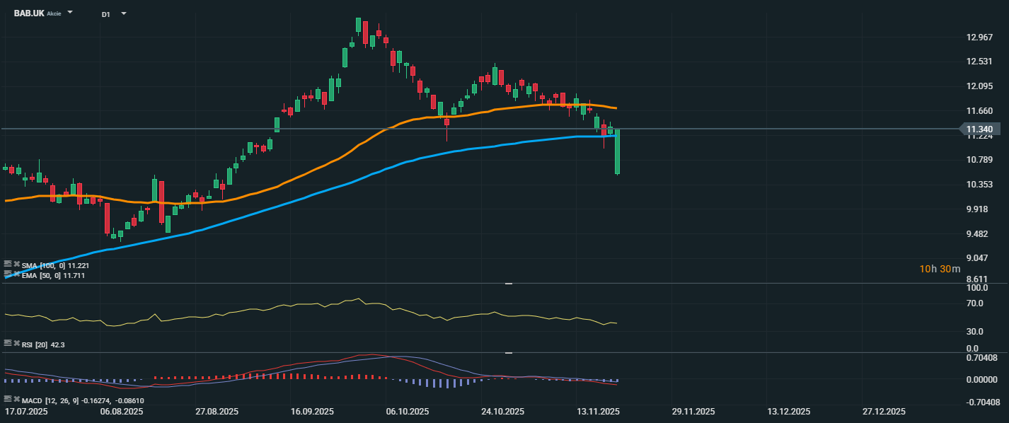 Akcie společnosti Babcock reagovaly na zveřejnění pololetních výsledků prudkým výkyvem směrem dolů, když krátce prorazily pod klíčový 100denní klouzavý průměr (SMA 100) na úrovni 11,22 GBP, ale aktuálně se vrátily zpět nad tuto hranici a obchodují se na ceně 11,34 GBP. I přesto se stále drží pod 50denním klouzavým průměrem (EMA 50) na úrovni 11,71 GBP, což značí technicky slabší krátkodobé momentum. RSI se nachází na hodnotě 42,3, tedy pod neutrální úrovní 50, a upozorňuje na přetrvávající tlak prodejců.