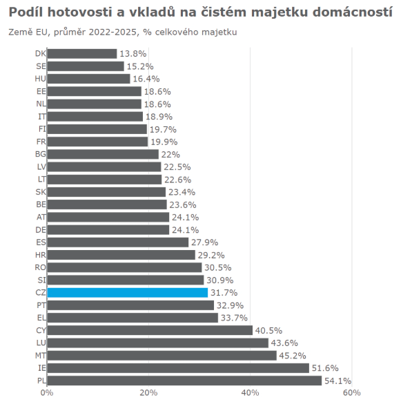Češi začínají být národem spořílků a podobně jako Němci budou značnou část svého jmění ukládat dál stranou. To je v zásadě závěr analýzy ČNB zveřejněné v poslední Zprávě o měnové politice. Centrální banka předpokládá, že míra úspor zůstane v nejbližších letech na 18% - tedy přibližně šest procentních bodů nad dlouhodobým průměrem. To samo o sobě není špatná zpráva, protože vyšší míra úspor může zvyšovat odolnost bilancí domácností i celého finančního systému a ulehčovat financování “perspektivních” projektů v české ekonomice. Tady však narážíme na dva problémy. Za prvé, české domácnosti jsou relativně konzervativní a zdráhají se peníze aktivně “vracet do ekonomiky”. A za druhé , když už to “risknou”, narazí na nerozvinutý domácí kapitálový trh a peníze častokrát končí buď v nemovitostech nebo v zahraničních akciích a fondech. Konzervativnost českých domácností se projevuje v tom, že značná část úspor historicky mířila do “málo produktivních” bankovních vkladů (například formou spořících účtů). Se startem energetické a inflační krize (roky 2022-2023) tomu navíc hrálo do karet lákadlo vyšších domácích úrokových sazeb. Až s jejich poklesem se situace trochu začala měnit, a to pravděpodobně proto, že míra úspor vzrostla disproporčně u vyšších příjmových skupin, které se v průběhu pandemie a inflační krize naučily aktivněji řídit své investice. I tak však podle našich odhadů podíl vkladů na čistém jmění českých domácností zůstává přibližně třetinový - což je viditelně nad evropským průměrem (viz graf). Jedním z důvodů může být právě i málo rozvinutý domácí kapitálový trh, který neumožňuje Čechům umístit úspory atraktivně na domácím trhu. Část peněz domácností pak utíká (i podle analýzy ČNB) do zahraničních akcií a fondů, což může být pro řadu zajímavých domácích projektů škoda. V zahraničí navíc investoři nesou devizové riziko, což může některé z nich opět odrazovat od odvážnějších investic. Výsledkem jsou příliš “konzervativní” a “málo výnosná” portfolia českých domácností, která málo podporují českou ekonomiku. Když pomineme Maďarsko nebo Bulharsko s výrazným podílem investic domácností v nemovitostech, mají nejnižší podíl “neproduktivních” vkladů na čistém jmění domácnosti v Dánsku a Švédsku, kde domácí kapitálový trh patří k nejrozvinutějším - podíl investic do akcií a fondů na čistém jmění domácností se tam pohybuje okolo 50%. Česko by mělo mít ambici posouvat se právě tímto směrem, i když je jasné, že to bude v každém případě běh na dlouhou trať.