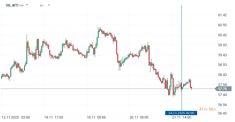 Vyhlídka na návrat ruských barelů se objevuje na pozadí křehké makroekonomické situace. Nejistota ohledně měnové politiky USA nadále tlumí chuť riskovat, i když komentáře prezidenta newyorské pobočky Fedu Johna Williamse znovu roznítily očekávání prosincového snížení sazeb. Trh nyní oceňuje pravděpodobnost snížení sazeb na 71 %.