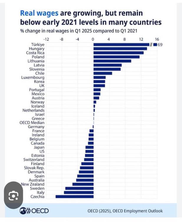 Důvěra spotřebitelů v českou ekonomiku v listopadu výrazně narostla na nejvyšší úroveň od roku 2019. Dosahuje 111,7 bodu, přičemž dlouhodobý průměr let 2003 až 2024 odpovídá hodnotě rovných 100 bodů. Naposledy byla důvěra spotřebitelů v tuzemské hospodářství vyšší v prosinci 2019, vyplývá dále z dat ČSÚ. To bylo ještě před propuknutím pandemie covidu. Letos v listopadu se tak důvěra spotřebitelů vůbec poprvé srovnává s úrovněmi právě roku 2019, který byl posledním, jejž nepoznamenaly tíživé děje v podobě právě pandemie, energetické drahoty, války na Ukrajině a jejích dopadů či mocné inflační vlny a prudkého propadu reálných mezd, jenž byl v Česku mezi lety 2021 až 2025 nejvýraznější ze všech zemí OECD (viz graf níže) a neblaze dolehl právě na spotřebitelskou důvěru.