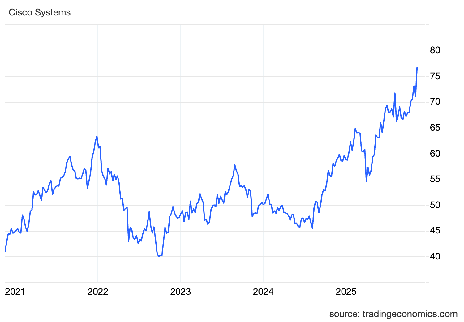 Americký výrobce síťového vybavení Cisco Systems reportoval výsledky hospodaření za 1. čtvrtletí fiskálního roku 2026, které skončilo 25. října 2025. Společnost zvýšila výhled očištěného zisku na akcii za celý rok, přičemž nový výhled překonal průměrný odhad analytiků. Podle agentury Bloomberg firma těží z rostoucích investic do umělé inteligence. Analytici však zároveň upozornili na slabší výkonnost bezpečnostní divize i dalších segmentů nenavázaných na AI. -