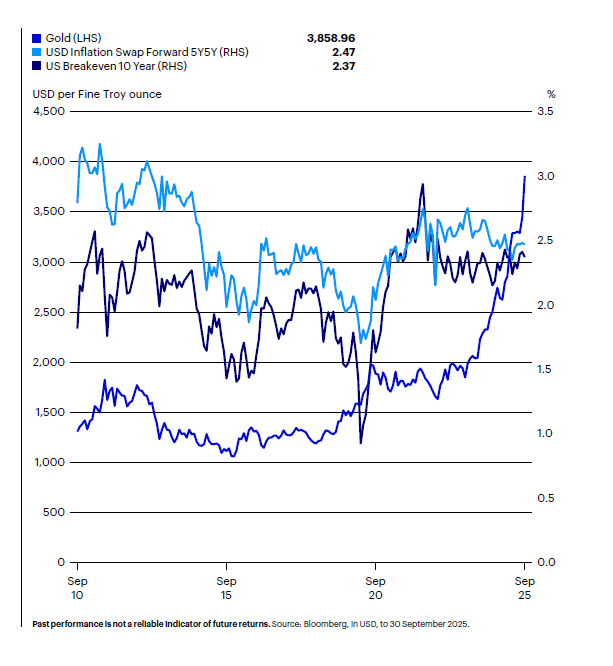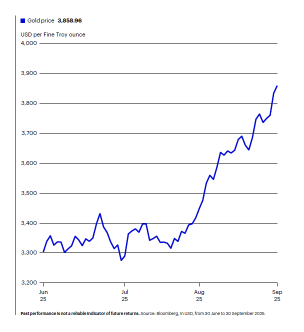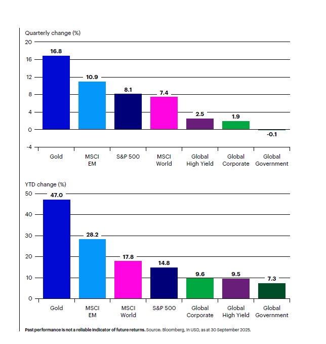 Ve třetím čtvrtletí roku 2025 proběhl 16,8% nárůst ceny zlata na pozadí silné výkonnosti rizikových aktiv, přičemž zlato jako bezpečné aktivum získalo téměř o 6 % více než akcie rozvíjejících se trhů a více než dvojnásobek globálních akcií rozvinutých trhů. Klíčovým faktorem nedávné poptávky po zlatě lze považovat rekordně vysoké akciové trhy, zejména, ale nejen, americké mega-kapitálové společnosti. Je pravděpodobné, že mnoho investorů drží zlato ve svých portfoliích, aby zmírnili dopad případného poklesu akcií, kdy by zlato mohlo plnit roli nekorelovaného diverzifikátoru. Stojí za zmínku, že historicky ty z největších korekcí trhu proběhly v říjnu. Za celý rok zlato také překonalo všechny hlavní akciové a dluhopisové trhy, přičemž rozdíl oproti druhému nejlepšímu hráči se v tomto čtvrtletí zvýšil. Akcie rozvíjejících se trhů nabraly na síle, zatímco globální dluhopisové trhy si také vedly dobře z historického hlediska.