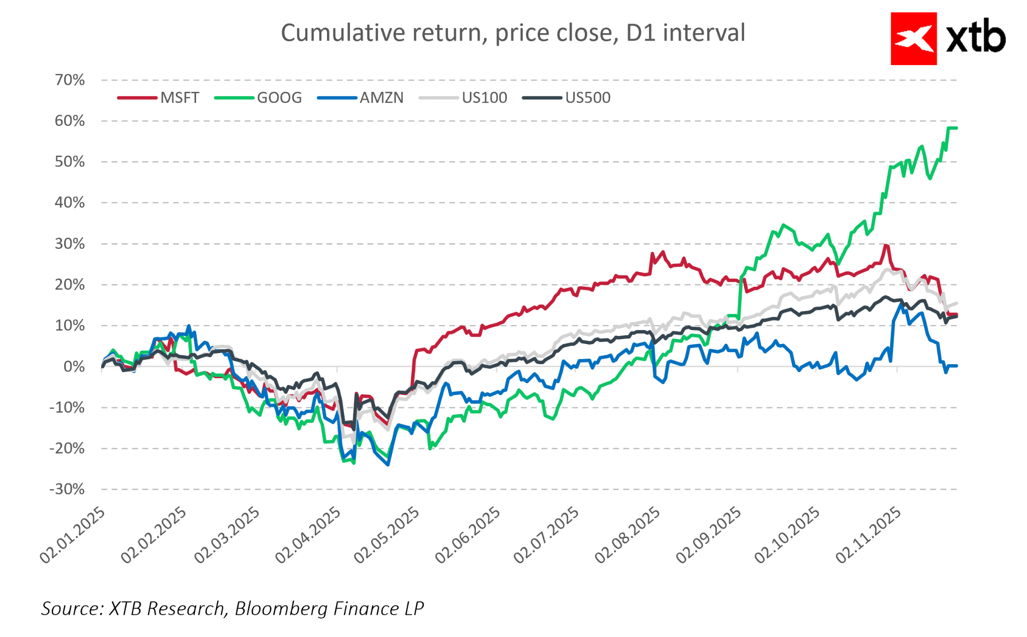 Shrnutí:Gemini 3 výrazně posiluje postavení Alphabetu jako klíčového hráče v oblasti umělé inteligence a schopnost trénovat model na vlastních procesorech TPU poskytuje společnosti strategickou výhodu z hlediska nákladů, technologií i provozu. Přesto je stále obtížné jednoznačně říci, že Alphabet získal plnou dominanci v závodě o AI. Technologický a tržní úspěch je zřejmý a poskytuje pevný základ pro další růst, ale budoucnost s sebou nese rizika a proměnlivé výzvy, které určí konečné postavení společnosti na trhu. Za zmínku rovněž stojí, že výnos akcií Alphabetu od začátku roku výrazně překonává konkurenty, jako jsou Microsoft a Amazon, i hlavní tržní benchmarky včetně S&P 500 a Nasdaq 100, což odráží rostoucí důvěru investorů ve strategickou pozici společnosti v oblasti umělé inteligence.