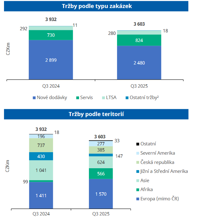 Tržby společnosti za první tři čtvrtletí roku dosáhly 3,60 mld. Kč. Minulý rok za 9M tržby činily 3,93 mld. Kč. Reprezentuje to tak meziroční pokles o 8,6 %. Pokles tržeb, ve srovnání se stejným obdobím roku 2024, je podle společnosti důsledkem časového posunu v rozhodování o projektech.