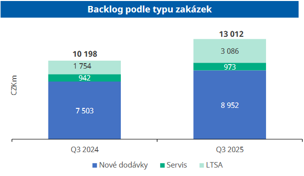 Nezpracované zakázky (backlog) vzrostly meziročně o 28 % na 13 mld. Kč. Ve 3Q společnost získala významnou veřejnou zakázku na výměnu generátorů v Temelíně. Další kontrakty byly v Dominikánské republice, Turecku a dalších smluv typu LTSA.