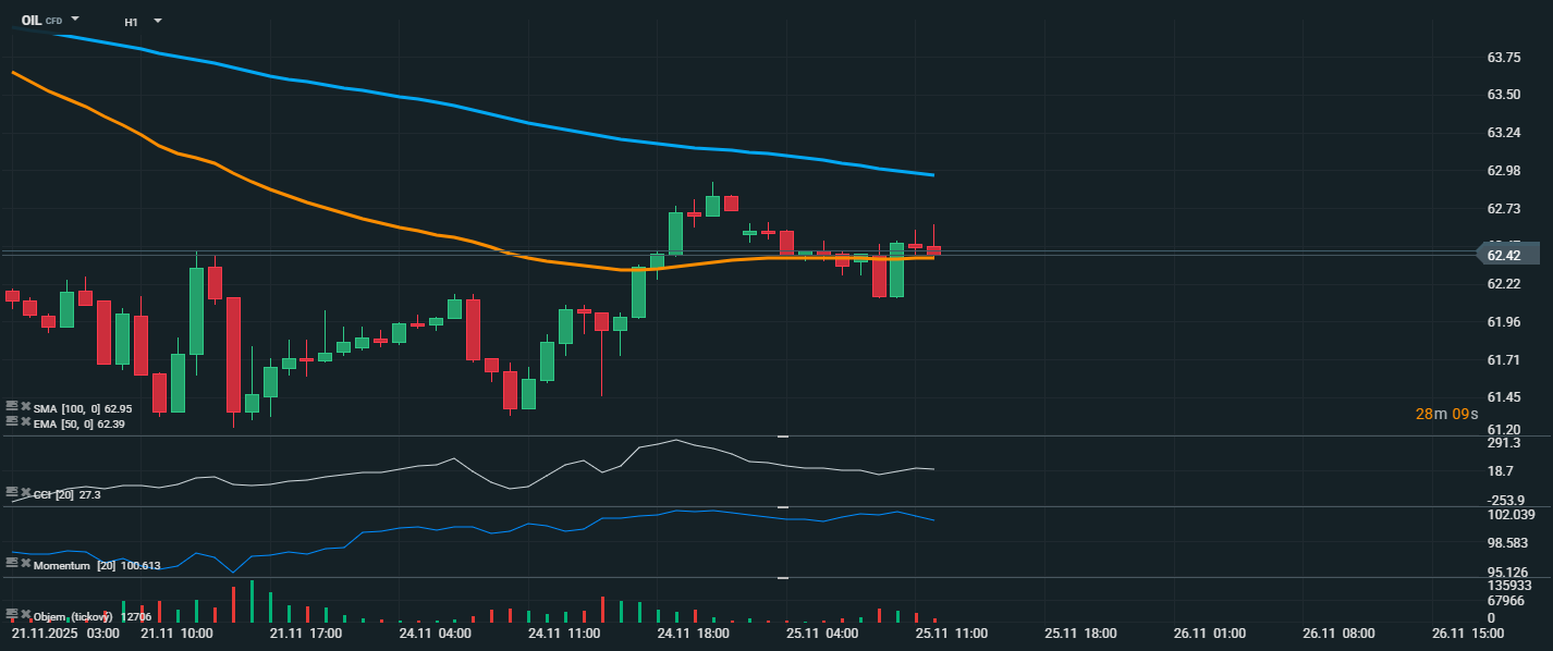 Cena ropy se aktuálně pohybuje kolem úrovně 62,42 USD, přičemž klouzavý průměr EMA 50 (62,39 USD) a SMA 100 (62,95 USD) tvoří úzkou rezistenční zónu. Pokud by cena prorazila nad SMA 100 (62,95 USD), mohl by se otevřít prostor k růstu směrem k úrovním kolem 63,50 USD. Naopak při zamítnutí a průrazu zpět pod EMA 50 by trh mohl opět testovat nižší hladiny kolem 61,40 USD.