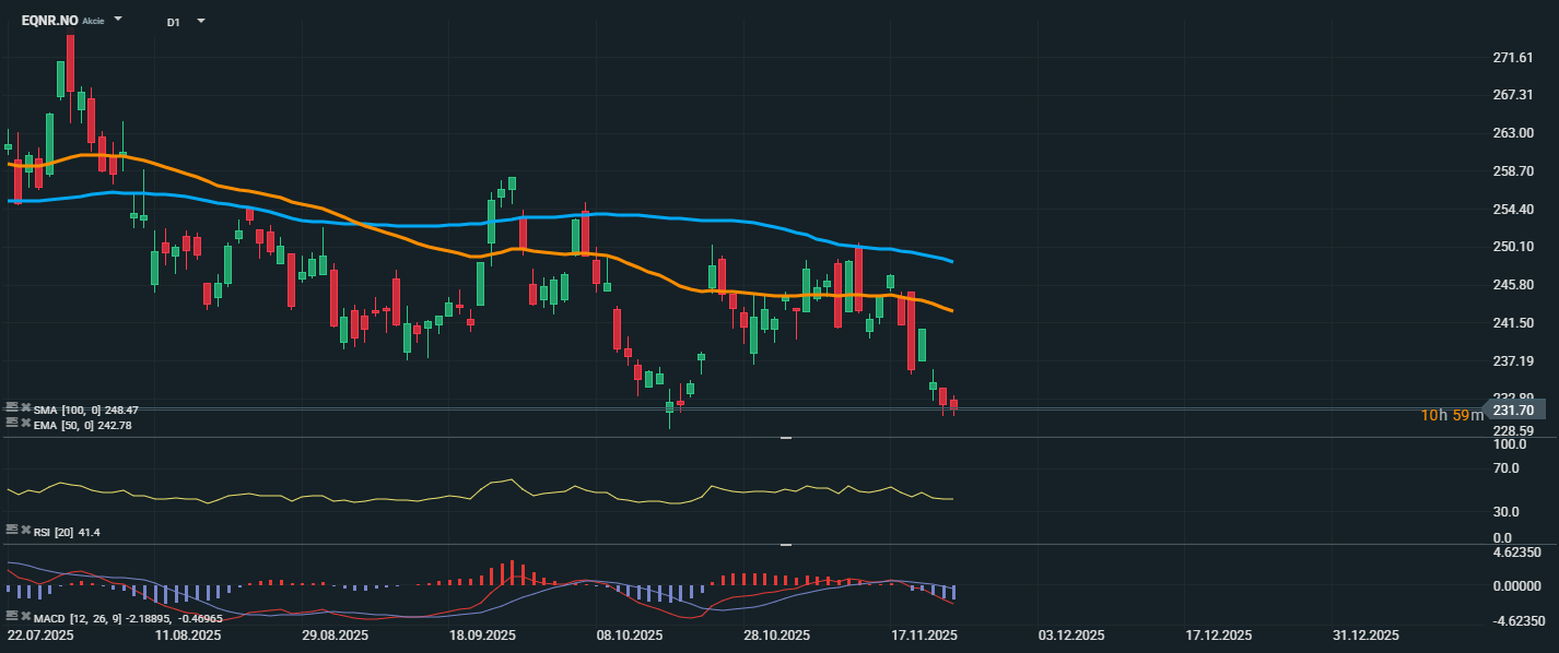 Akcie norské energetické společnosti Equinor se aktuálně obchodují na úrovni 231,70 NOK, tedy výrazně pod klouzavými průměry EMA 50 (242,78 NOK) a SMA 100 (248,47 NOK). To značí setrvalé medvědí momentum a potvrzuje klesající trend, který akcie sledují již několik týdnů. RSI se nachází pod neutrální hodnotou 50, ale zatím mimo pásmo přeprodanosti, což ukazuje na přetrvávající tlak na pokles bez známek extrémního vyčerpání.