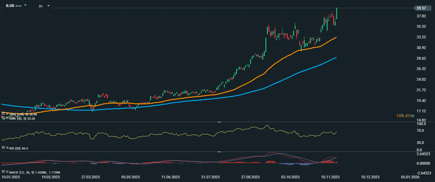 Akcie společnosti Barrick Gold předvedly v posledních měsících mimořádně silný růst, když aktuálně dosahují ceny 39,57 USD. Cena se výrazně odrazila od klouzavých průměrů – EMA 50 (33,26 USD) a SMA 100 (28,88 USD) – které potvrdily silný růstový trend. RSI se nachází těsně pod překoupenou zónou, což ukazuje na silný nákupní zájem, ale zároveň varuje před možným krátkodobým vyčerpáním. Z technického pohledu je trend nadále silně býčí, ale vzhledem k prudkému růstu a hodnotám RSI je možná krátkodobá korekce nebo konsolidace. Klíčovou podporu nyní tvoří úroveň kolem 33 USD, kde se nachází EMA 50.