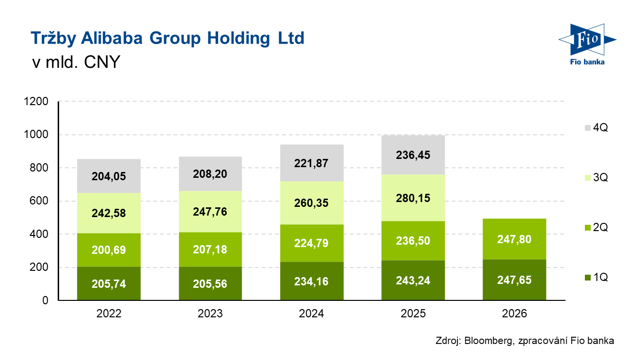 Klíčová slova: Poptávka | ADR | Bloomberg | Certifikát | Dividendový výnos | P/E | Ukazatel | Výnos | USD | Obchodování | Zisk | Výsledky | EPS | Banka | Fio banka | Cena | Fio | Investiční | Zisky | Cílová cena | EBITDA | Tržby | Alibaba | Kapitalizace | Konsensus | Očekávání analytiků | Očekávání | CNY | Čistý zisk | Alibaba Group | Generální ředitel | Ziskovost | Hospodaření | Výsledky hospodaření | Alibaba Group Holding | Pokles | Zisk EBITDA | Finanční ředitel | Meziroční růst | BABA | FCF | Vývoj | Tržby společnosti | Růst | E-commerce | Ekonomiky | Solidní růst | Očištěný čistý zisk | Umělé inteligence | Růst tržeb | WU | Silný růst | AI | Divize | Společnosti | Rychlý růst | Společnost | Výsledky společnosti | 3М | Alibaba (BABA) | Alibaba Group Holding Ltd | Silná poptávka | Solidní růst tržeb | Komentář vedení | Holding | Technologický gigant | Čínský technologický gigant | Cloudové služby | Služby | Fio banka, a.s. | Taobao | Poptávka po umělé inteligenci | Michal Bárta | ADR Alibaba | Group | Volné hotovostní toky | Hotovostní toky |