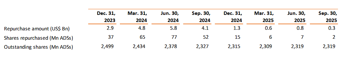 V průběhu kvartálu Alibaba zpětně odkoupila 17 mil. akcií (ekvivalent přibližně 2 mil. ADR) celkem za 253 mil. USD.