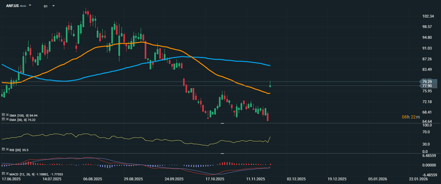 Akcie společnosti Abercrombie & Fitch reagovaly na pozitivní výsledky a zvýšený výhled prudkým růstem a aktuálně se obchodují na úrovni 79,29 USD. Tento růst představuje výrazný průraz nad klouzavý průměr EMA 50 (75,22 USD), což je první pozitivní technický signál po delším období sestupného trendu. Nejbližší silnější technická rezistence je nyní v oblasti SMA 100 (84,94 USD).