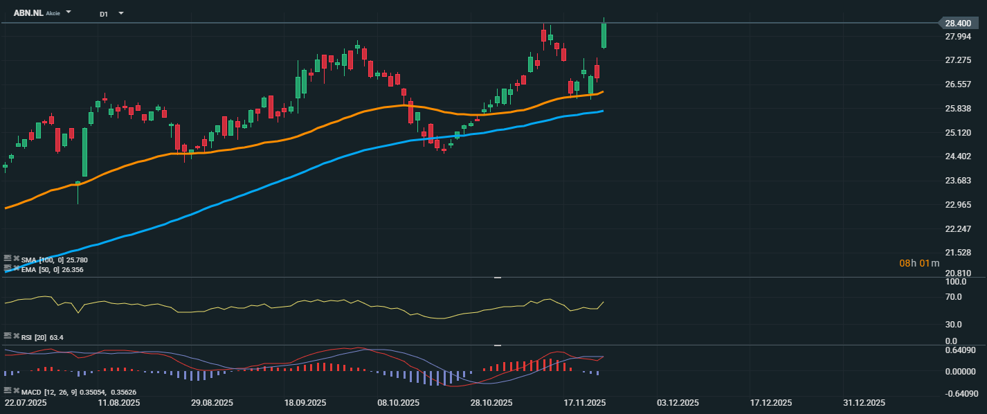 Akcie nizozemské banky ABN Amro dnes silně posílily a aktuálně se obchodují na úrovni 28,40 EUR. Reakce trhu odráží pozitivní přijetí oznámené restrukturalizace, která zahrnuje masivní snížení počtu zaměstnanců a prodej vedlejších aktivit. Cena akcií se výrazně odrazila od podpory v oblasti klouzavého průměru EMA 50 (26,36 EUR) a současně se drží nad SMA 100 (25,78 EUR), což potvrzuje býčí technické nastavení. RSI je na hodnotě 63,4, tedy v růstovém pásmu, ale stále pod hranicí překoupenosti, což naznačuje, že akcie má ještě prostor k dalšímu růstu bez bezprostředního rizika korekce.