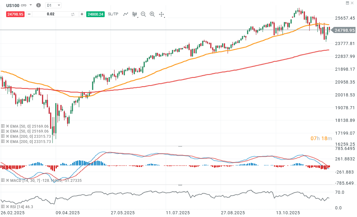 Američané mohou oslavovat znovuotevření vlády, konec rozhodovací paralýzy a obnovení financování klíčových programů. Trhy však důvod k oslavám nevidí. Obchodování na Wall Street dnes začíná výrazným poklesem. Futures na US100 klesají o přibližně 1 %, S&P 500 a Russell ztrácejí zhruba 0,5 %. -