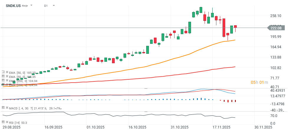 - Nedávný výprodej v technologickém sektoru přinesl krátkodobý tlak na cenu akcií – SanDisk dnes dopoledne klesl o 3 % po včerejším růstu o 13 % – nicméně dlouhodobý trend zůstává velmi silný.