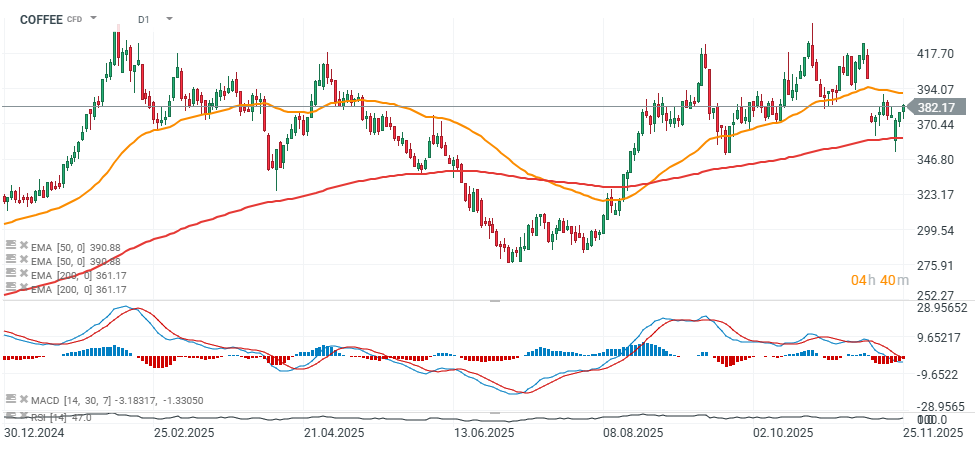 Futures na kávu (ICE COFFEE) posilují po sérii prudkých poklesů. Ceny arabiky v New Yorku rostou kvůli obnoveným obavám ze sucha v Brazílii, zatímco robusta obchodovaná v Londýně opět čelí tlaku kvůli návratu suchého počasí a obnovené sklizni v oblasti Dak Lak ve Vietnamu. Kontrakt na kávu roste již třetí seanci v řadě, podpořený obavami z nedostatku srážek v Brazílii – v regionu Minas Gerais aktuálně spadlo pouze 49 % historického průměru.