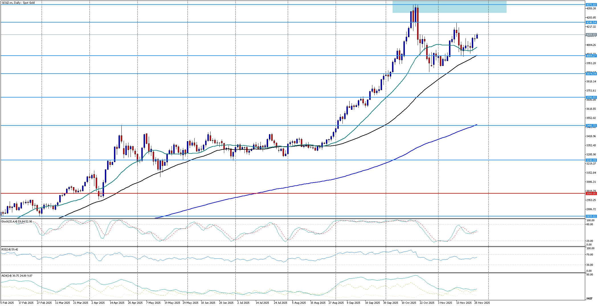 Zlato se v pondělí výrazně odrazilo poté, co o den dříve našlo pevnou podporu v oblasti 4 020 USD. Aktuální oslabení sice část zisků umazává, nicméně pondělní vývoj potvrdil formaci vyššího minima, i když vyšší maximum zatím zůstává mimo hru. To ponechává trh v dočasně neutrálním nastavení. Hlavní hnací silou růstu byly rostoucí spekulace o prosincovém snížení sazeb Fedu. Americká data z trhu práce za září potvrdila zřetelné oslabení, avšak zásadní impuls přišel spíše z komentářů představitelů Fedu. Prezident newyorské pobočky Fedu John Williams v pátek naznačil, že prostor pro další uvolnění měnové politiky je otevřený. Následně guvernér Waller v pondělí uvedl, že slabost trhu práce podporuje myšlenku prosincového snížení sazeb. I když je Waller dlouhodobě považován za zastánce měkčí politiky, jeho výroky – navazující na Williamsovy – zvýšily pravděpodobnost prosincového snížení z 60 % na 70 %, a to i přes nejistotu kolem inflace. Údaje CPI byly během shutdownu americké vlády zveřejněny v mírně nižších hodnotách, než se čekalo. Pokud by i PPI dopadlo mírněji, mohlo by to trhům umožnit udržet zvýšené sázky na prosincové snížení sazeb, což by zlatu poskytovalo další podporu. Z technického pohledu by zlepšení výhledu přineslo proražení odporu v okolí 4 245 USD. Takový krok by mohl otevřít cestu k historickému maximu 4 381,46 USD z 20. října, případně až k psychologické úrovni 4 500 USD. Naopak medvědí výhled by nabral na síle při poklesu pod 3 925 USD, což by zlato posunulo pod 50denní EMA a otevřelo prostor směrem k 3 800 USD.