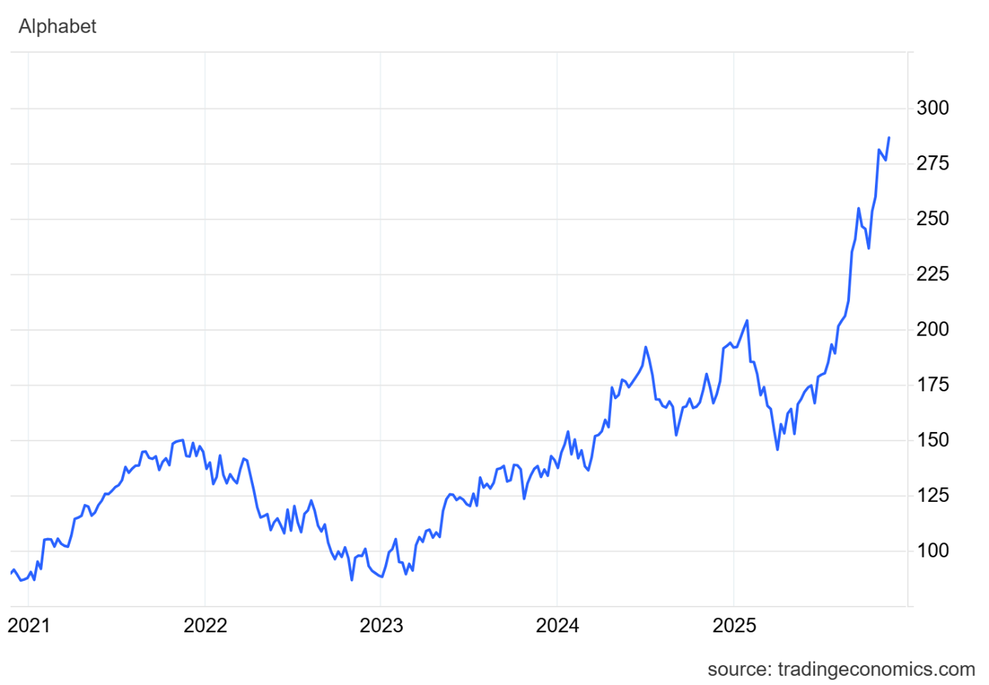 Trh na odhalení tohoto podílu zareagoval velmi pozitivně – v pondělí cena akcií Alphabetu vzrostla o 3 %, přičemž za celý rok si již k tomuto datu připisala více než 50 %.* Pro investory je klíčové, že tento silný výkon je současně podložen především robustními finančními výsledky. Alphabet za třetí kvartál dosáhl své první tržby ve výši více než 100 miliard USD. Tento milník byl poháněn zejména růstem cloudové divize, a také stabilní návratností z kapitálových investic do umělé inteligence (AI).