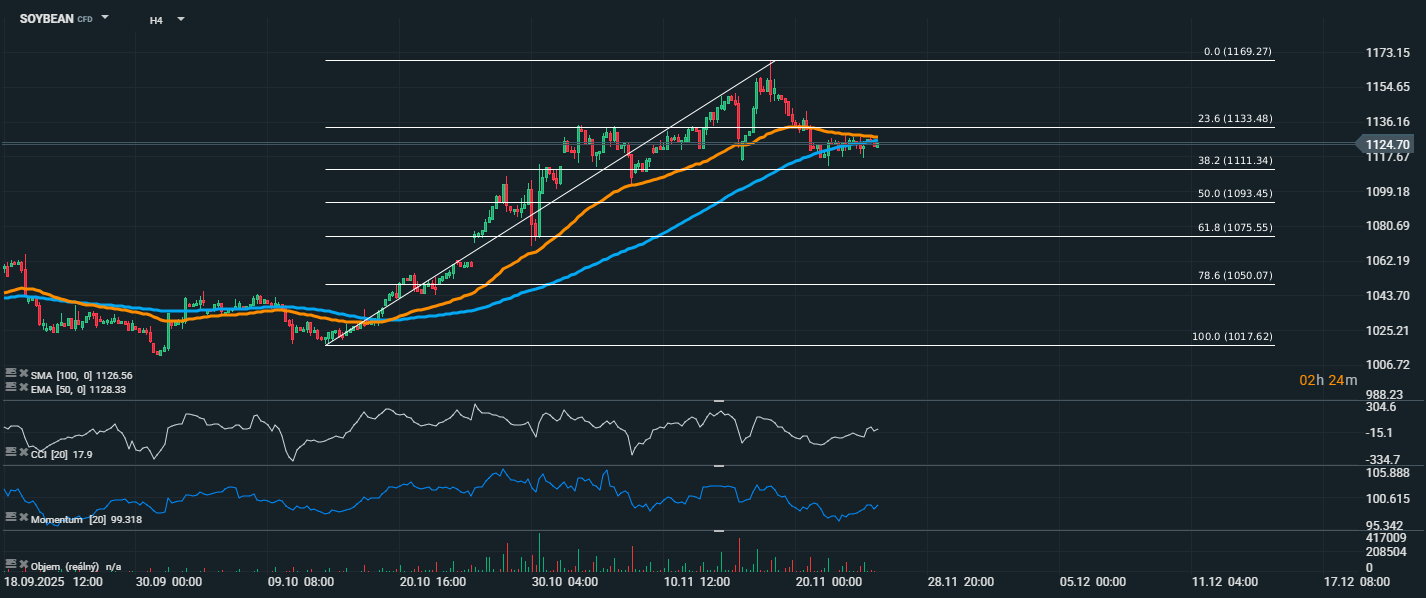 Ceny sójových bobů vykazují stabilizaci v úzkém pásmu po předchozím růstu a následné korekci z lokálního maxima na úrovni 1169,27 USD. Aktuálně se obchodují na ceně 1124,70 USD, což je mírně pod klouzavým průměrem EMA 50 (1128,33 USD) a těsně pod SMA 100 (1126,56 USD). Tato situace ukazuje na nerozhodnost trhu a absenci silného směru.