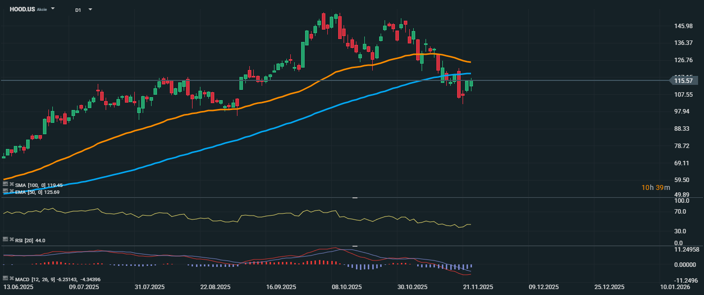 Akcie společnosti Robinhood aktuálně testují cenovou úroveň 115,57 USD po předchozím výrazném poklesu. Krátkodobý trend zůstává negativní, protože cena se nachází pod klouzavými průměry – konkrétně pod EMA 50 (125,69 USD) i SMA 100 (119,45 USD). Tento vývoj potvrzuje slabost na trhu a nedostatečnou sílu kupců. RSI se drží na hodnotě 44,0, což naznačuje neutrální až mírně přeprodané podmínky. Z technického hlediska se trh snaží vytvořit dočasné dno, ale pro potvrzení změny trendu bude klíčové, zda se akcie dokážou vrátit nad hranici 120 USD, tedy nad SMA 100. Pokud by cena nedokázala udržet současné úrovně, hrozí návrat k nižším supportům kolem 107 USD nebo dokonce k 100 USD.