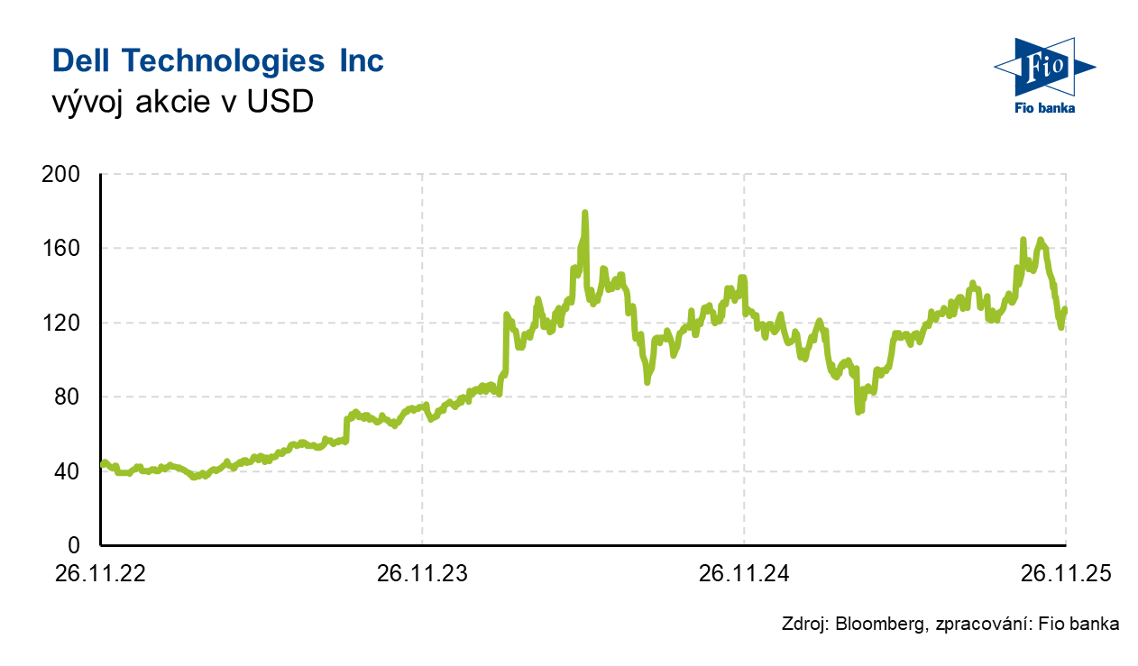 Americká společnost Dell Technologies podnikající v oblasti informačních technologií včera po uzavření trhu zveřejnila výsledky hospodaření za 3Q fiskálního roku 2026, který skončil 31. října 2025. Tržby společnosti vzrostly meziročně o 11 % na 27,01 mld. USD. Očištěný zisk na akci vzrostl meziročně o 17 % na 2,59 USD, čímž překonal očekávání Wall street ve výši 2,21 USD. Analytici ze Citi hodnotí výsledky za lepší, než se předpokládalo. Zároveň analytici nejvíce vypichují ve výsledcích růst v dodávkách AI serverů. Společnost také navýšila svůj výhled tržeb pro čtvrtý kvartál a zároveň pro celý fiskální rok 2026.