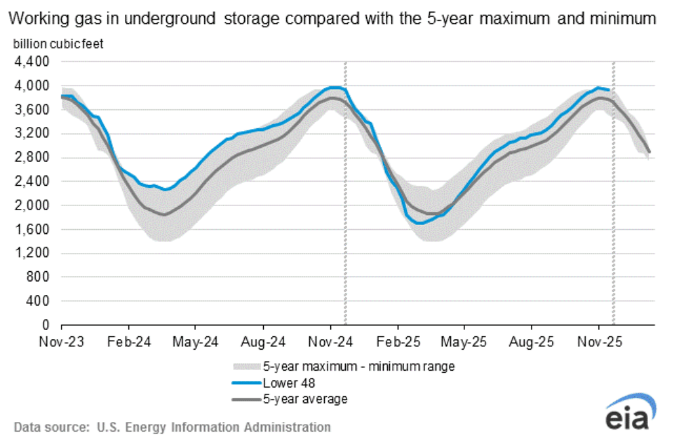 Americký úřad pro energetické informace dnes oznámil, že domácí zásoby zemního plynu se za týden končící 16. prosincem snížily o 87 miliard krychlových stop z původního poklesu o 50 miliard krychlových stop v předchozím týdnu a pod odhady analytiků, které činily pokles o 93 miliard krychlových stop. -
