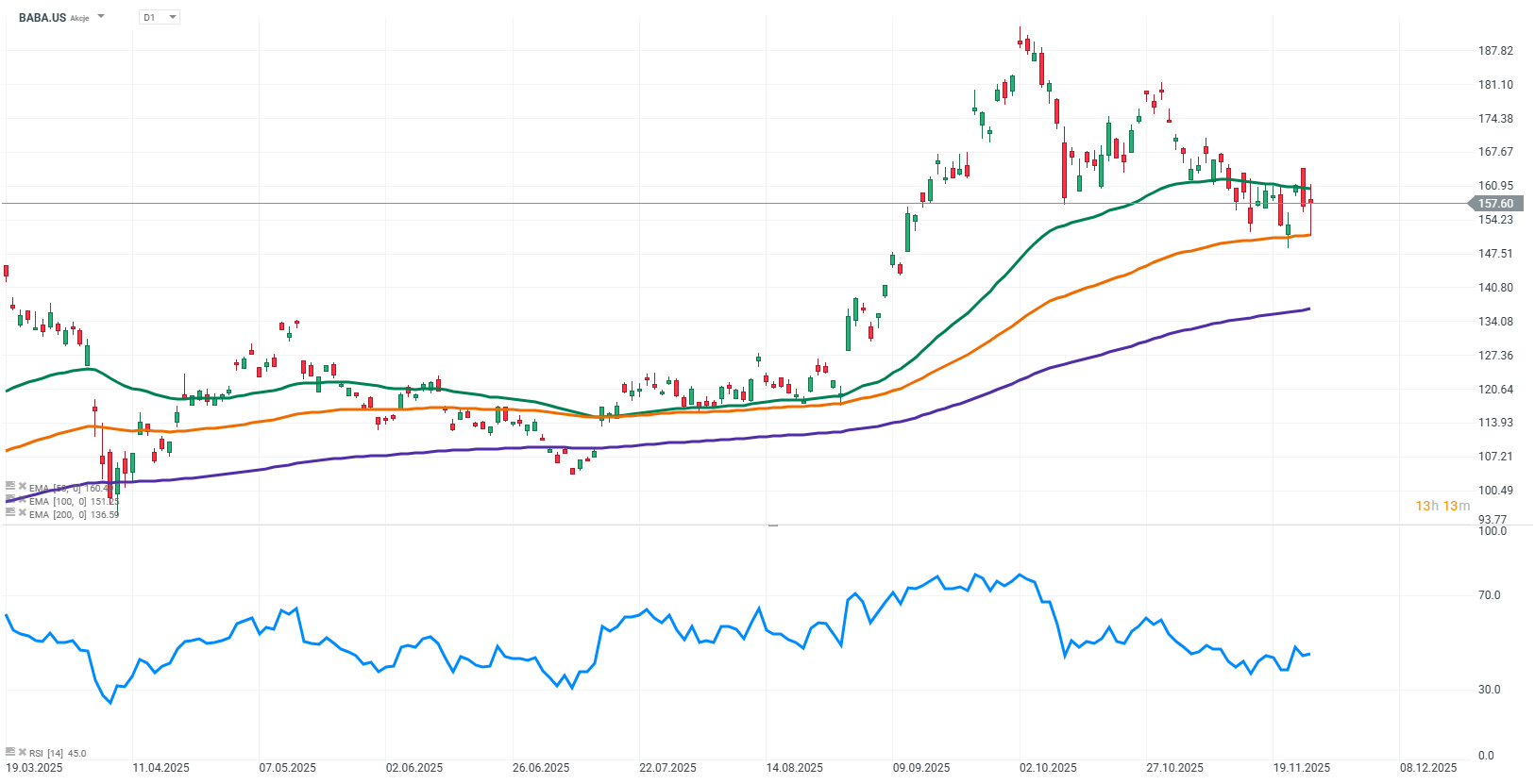 Společnost Alibaba oznámila čtvrtletní výsledky, které nedosáhly očekávání analytiků, když vykázala tržby ve výši 236,45 miliardy jüanů (32,79 miliardy USD) oproti očekávaným 237,24 miliardy jüanů. Na tuto zprávu akcie v USA klesly v premarketu o více než 4 %, přestože od začátku roku posílily přibližně o 58 %. -