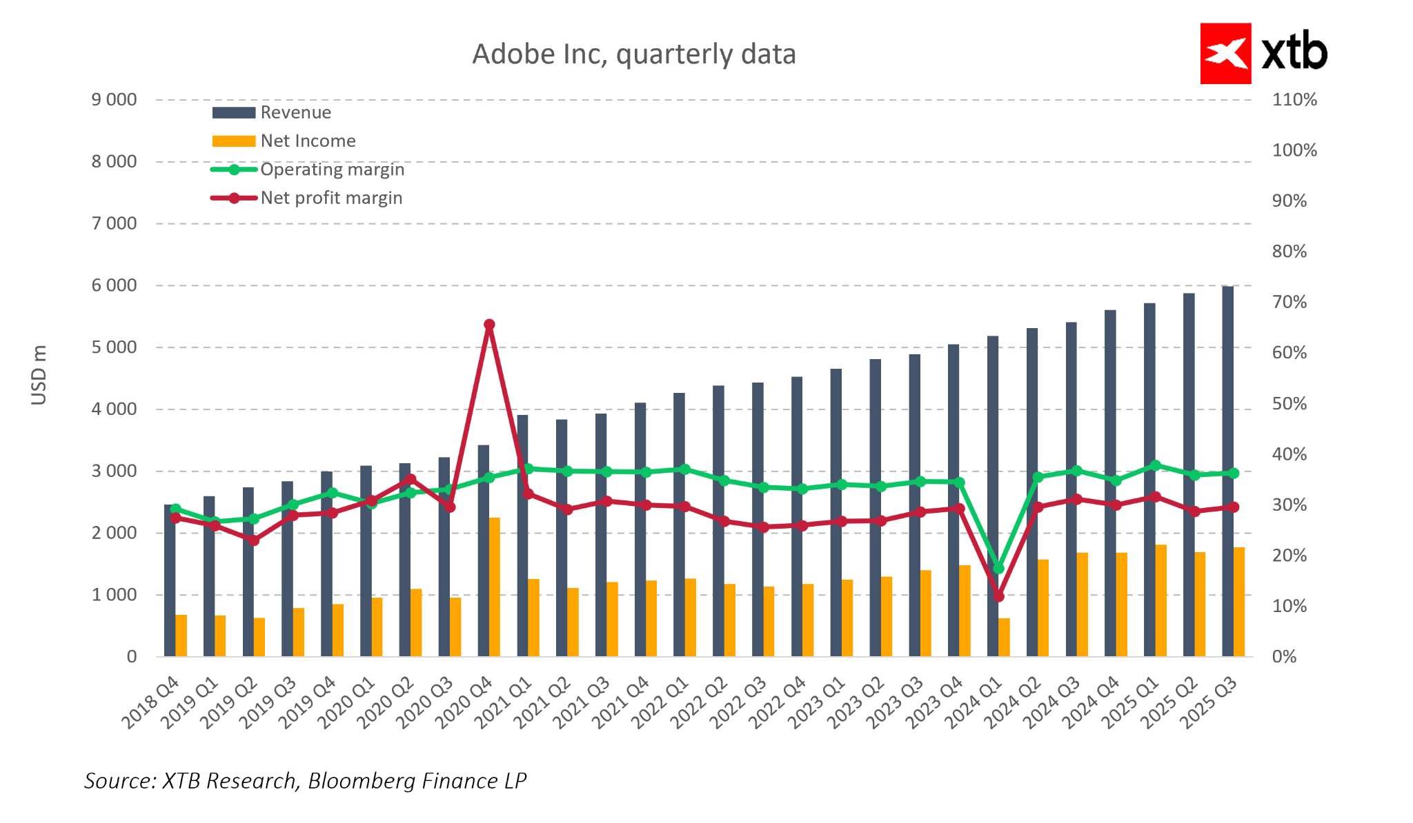 Adobe trvale zvyšuje své tržby, které ve třetím čtvrtletí roku 2025 dosáhly téměř šesti miliard dolarů. Tento růst je podporován systematickým rozšiřováním uživatelské základny a rostoucími prodeji předplatitelských služeb, které tvoří jádro obchodního modelu společnosti. Stabilní vývoj tržeb je patrný i z historických dat – od roku 2018 rostou čtvrtletní tržby téměř nepřetržitě, a to i během období hospodářského zpomalení. Zároveň si společnost udržuje vysokou provozní efektivitu – hrubé marže se pohybují kolem 35 % a čisté marže se ve většině období blíží 30 %.