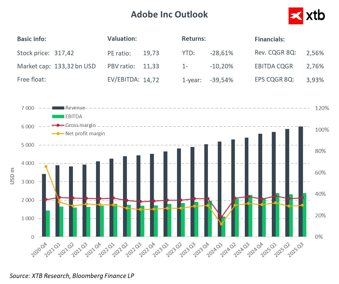 Adobe Inc. již dlouho patří mezi lídry v oblasti kreativního softwaru a digitálních médií. Každý, kdo někdy tvořil grafiku, upravoval video nebo navrhoval marketingové materiály, zná produkty této společnosti. Photoshop, Illustrator, Premiere Pro a celá sada Creative Cloud se staly oborovým standardem, nezbytným nástrojem pro práci v kreativní sféře. V posledních letech si Adobe nejen udrželo svou vedoucí pozici, ale zároveň rychle rozšiřuje cloudové služby a segment digitální zkušenosti, zaměřený na firmy hledající lepší zákaznický přehled a podporu online prodeje. Z fundamentálního pohledu se zdá, že ocenění společnosti neodráží plně její potenciál. Stabilní růst tržeb, rostoucí báze předplatitelů a inovace v oblasti umělé inteligence naznačují, že akcie Adobe mohou být výrazně podhodnocené vůči svému dlouhodobému výhledu.