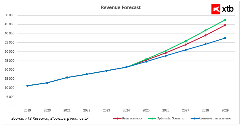 Adobe stále roste, ale mírně pomalejším tempem. Tržby by do roku 2029 dosáhly cca 37,5 miliardy USD. Tento scénář předpokládá náročnější tržní podmínky, pomalejší investice do IT a silnější konkurenční tlak. I za těchto předpokladů si firma udržuje stabilní expanzi, což ukazuje na odolnost jejího ekosystému a vysokou loajalitu zákazníků.