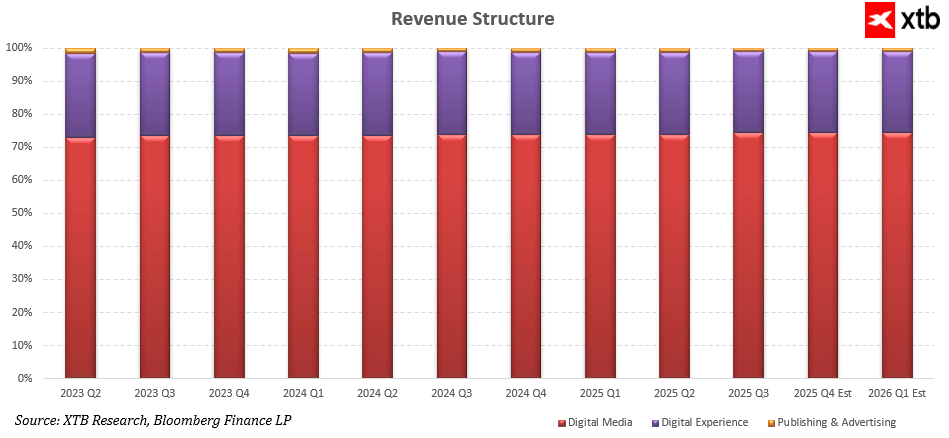 Struktura tržeb společnosti Adobe odráží predikovatelnost a opakovatelnost jejích operací. Segment Digital Media, zahrnující Creative Cloud a Document Cloud, tvoří přibližně tři čtvrtiny celkových tržeb, přičemž jeho podíl zůstává stabilní s mírným růstovým trendem. To potvrzuje efektivní monetizaci jak tradičních kreativních nástrojů, tak nových řešení založených na umělé inteligenci. Segment Digital Experience, který zahrnuje marketing, analytiku a služby zákaznické zkušenosti, dlouhodobě přispívá přibližně jednou čtvrtinou tržeb a roste podobným tempem jako celá firma. Nejmenší podíl má segment Publishing and Advertising, jehož přínos je marginální a v čase prakticky neměnný, což ukazuje, že hlavní hodnotu Adobe vytváří dva hlavní obchodní pilíře.