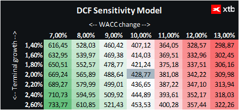 Pro ocenění byla použita vážená průměrná cena kapitálu (WACC) ve výši 10 %, která reflektuje náklady vlastního kapitálu, nízkou míru zadlužení společnosti a specifika technologického sektoru. Terminální hodnota počítá s dlouhodobým růstem tržeb o 2 % po roce 2029, což odpovídá stabilní a vyzrálé pozici Adobe v sektoru digitální kreativity a marketingu.