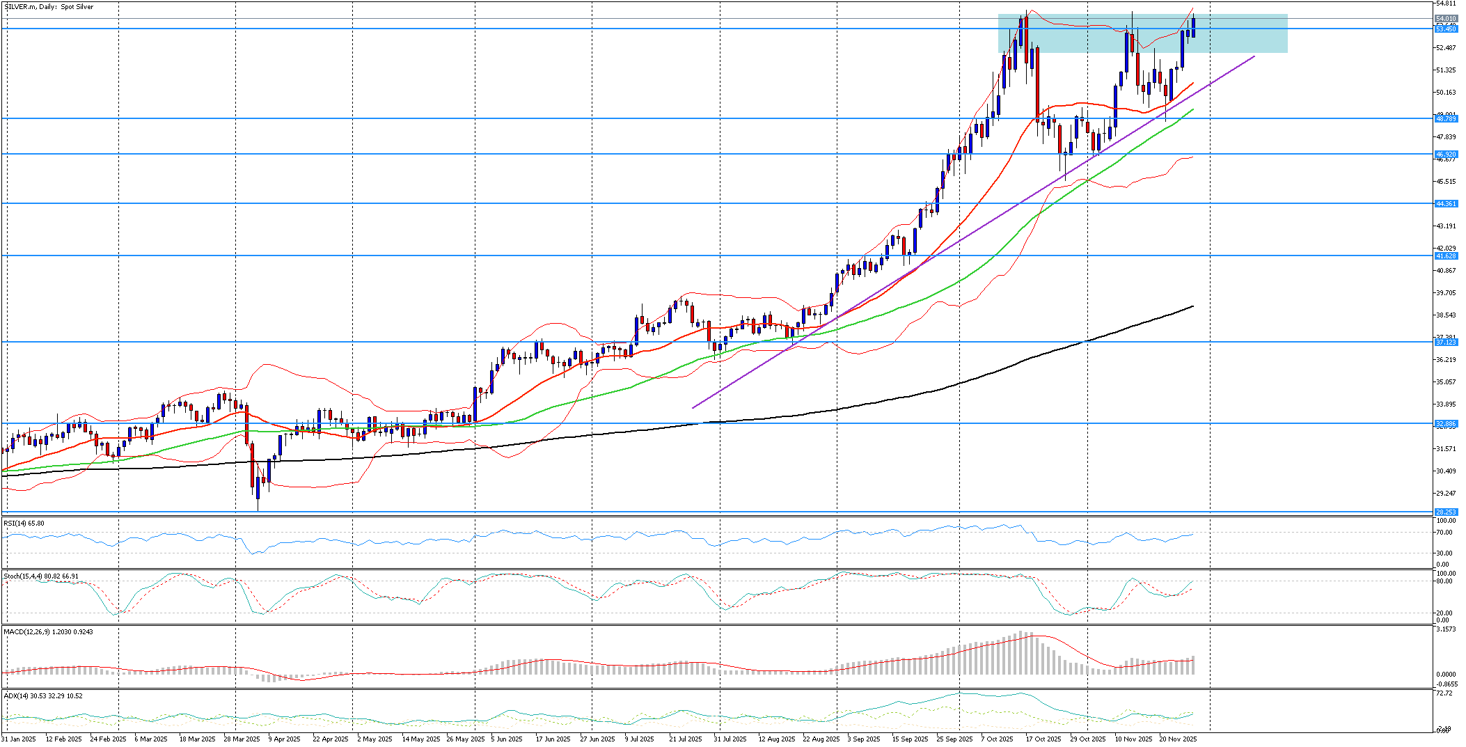 Stříbro v posledních dnech pokračovalo v mimořádně silném růstovém trendu a vystoupalo na nové historické maximum, jen krátce poté, co vůbec poprvé překonalo psychologickou hranici 50 dolarů za unci. Během aktuální seance dosáhlo intradenního vrcholu na 53,44 USD, odkud následně mírně korigovalo. Říjen zatím přinesl nárůst o téměř 10 %, čímž se celková výkonnost za rok zvýšila přibližně na 77 % – jde o jeden z nejlepších výsledků mezi komoditami v roce. -
