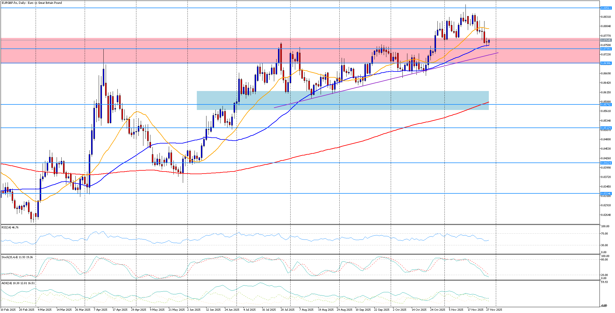 Měnový pár EUR/GBP ve středu zaznamenal výrazný pokles poté, co trhy reagovaly na nový rozpočtový plán kancléřky Rachel Reeves a její jasně potvrzený závazek k fiskální disciplíně. Prodejní tlak zastavila až silná podpora v blízkosti 50denního jednoduchého klouzavého průměru (SMA) na 0,8745, odkud se pár začal stabilizovat. Tato oblast nyní představuje potenciální odrazový bod směrem k rezistenční zóně 0,8815–0,8840. Pokud kupci udrží současné momentum, dalším možným cílem by mohla být úroveň 0,8865 – dvouapůlleté maximum, které trh v minulosti respektoval. Krátkodobému růstu by nahrával i odraz od střednědobé vzestupné trendové linie, která se nachází kolem 0,8725. Pokud tato linie vydrží, celkový výhled zůstane jednoznačně pozitivní. Na druhé straně průlom pod úroveň 0,8725 by narušil dosavadní býčí strukturu a mohl přesunout pozornost k dalším supportům na 0,8665 a 0,8633. Tyto cenové body představují důležité úrovně, které by v případě výraznějšího poklesu hrály roli hlavních cílů prodeje. Indikátory hybnosti mezitím naznačují možnost oživení. Stochastický oscilátor vystoupil z přeprodaného pásma a pokračuje v růstu, zatímco RSI se snaží překonat neutrální hranici 50, což podporuje mírně pozitivní výhled. Celkově EUR/GBP zatím drží býčí strukturu a pozitivní trend. Pouze jasný pokles pod střednědobou vzestupnou trendovou linii by naznačil nástup slabší dynamiky a vznikající medvědí scénář.