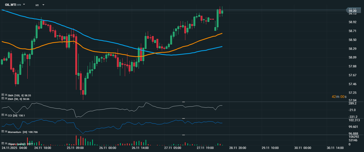 Cena ropy WTI zaznamenala další růst a aktuálně se obchoduje kolem 59,20 USD za barel, čímž pokračuje v odrazu od předchozích minim a potvrzuje krátkodobý býčí trend. Trh úspěšně prorazil nad klouzavé průměry EMA 50 (58,66 USD) a SMA 100 (58,35 USD), které nyní tvoří důležitou technickou podporu. CCI se nachází na úrovni 150,1, což signalizuje překoupený trh, ale zároveň potvrzuje silný nákupní zájem. Momentum (100,8) zůstává pozitivní a podporuje pokračující růstový impuls. Cena během posledních seancí vykázala vyšší minima i maxima, což je typické pro tržní strukturu v rostoucím trendu.