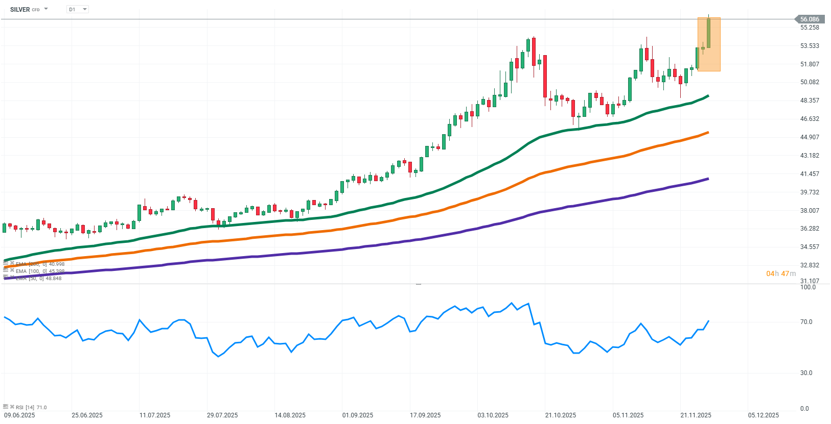 Aktuálně stříbro překonalo hranici 56 USD za unci, čímž nastavilo nové rekordy a ukazuje citlivost trhu na fundamentální i makroekonomické faktory.