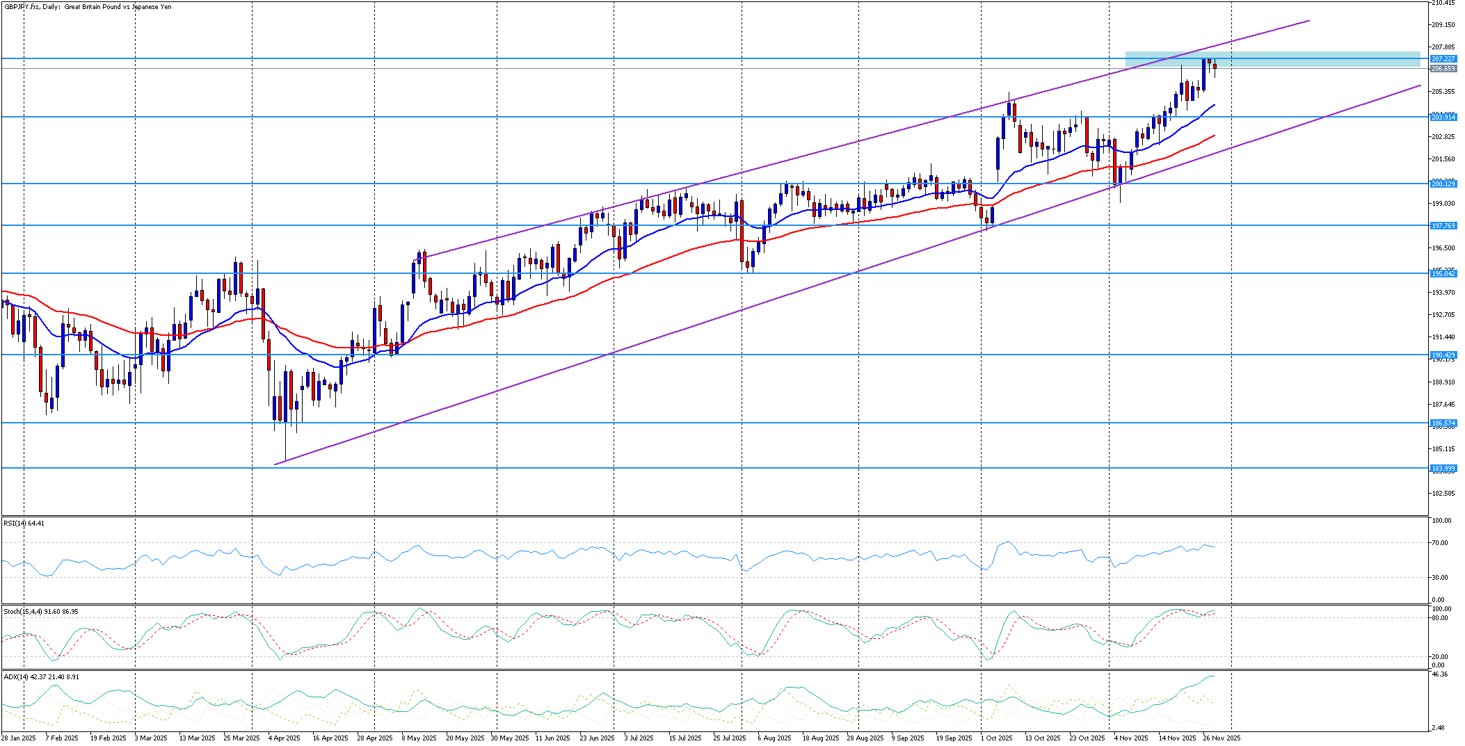 GBP/JPY se blíží ke třetímu růstovému týdnu v řadě, během něhož se cena postupně zrychlila směrem k novému šestnáctiměsíčnímu maximu 207,18. Optimismus na libře podpořil zejména nový rozpočet britského ministra financí, který zmírnil obavy ohledně fiskální udržitelnosti. Na straně jenu sice stabilní tokijská inflace CPI a nečekaný růst průmyslové produkce částečně podpořily páteční komentáře BoJ o možném zvýšení sazeb, avšak reakce trhu zůstává zatím spíše nevýrazná. Pár se v tuto chvíli obchoduje těsně pod maximem roku 2024 na úrovni 206,65, ale již třikrát nedokázal prorazit rezistenci u 207,18, což vyvolává spekulace, že prodejní tlak může postupně sílit. Technické indikátory naznačují přehřátí – RSI i stochastický oscilátor upozorňují, že poslední růst byl poměrně strmý. Pokud se ceně podaří udržet nad oblastí 205,70, může trh znovu zamířit k zásadní rezistenci 208,60. Její průlom by byl silným býčím signálem a mohl by otevřít cestu k úrovni 213,00, která představovala významnou bariéru již v roce 2008. V opačném scénáři může posílení prodejců vést k návratu směrem ke 20dennímu SMA u 204,00 a následně k 50dennímu SMA v okolí 202,53. Tyto zóny představují klíčové krátkodobé podpory, jejichž prolomení by mohlo naznačovat začátek hlubší korekce. Celkově si GBP/JPY zachovává býčí tón nad 205,70, ale překoupené podmínky ukazují, že trh může v nejbližších dnech spíše stabilizovat než výrazně pokračovat v růstu.