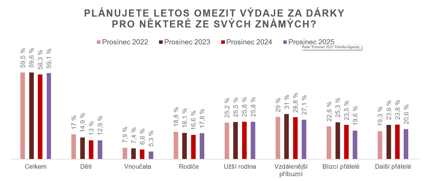 Češi budou letos šetřit na „dárcích pod stromeček“ o něco více než loni. Úspory plánuje téměř 60 % domácností, zatímco vloni to bylo přibližně 58 %. Mírně narostl podíl těch, kteří šetří na dárcích pro rodiče, letos tuto možnost uvádí téměř 18 % respondentů. Naopak méně domácností, než loni plánuje omezovat výdaje na přátele či vzdálenější příbuzné, výdaje pro tyto skupiny snižuje zhruba pětina dotázaných. Pouze jeden z deseti Čechů letos šetří na dárcích pro děti, což je prakticky stejný podíl jako vloni.