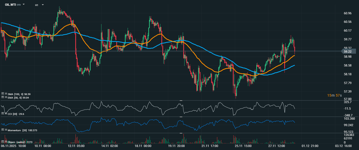 Cena ropy WTI se aktuálně obchoduje na úrovni 59,22 USD. Po předchozím poklesu došlo k výraznému obratu trendu a cena prorazila nad klouzavé průměry EMA 50 (59,04 USD) i SMA 100 (58,59 USD), což signalizuje změnu krátkodobého sentimentu na býčí. Momentum je na úrovni 100,4, což potvrzuje rostoucí nákupní dynamiku. Naopak CCI se nachází na -29,6, což naznačuje mírné oslabení po předchozím prudkém růstu, ale stále zůstává mimo pásmo přeprodanosti.