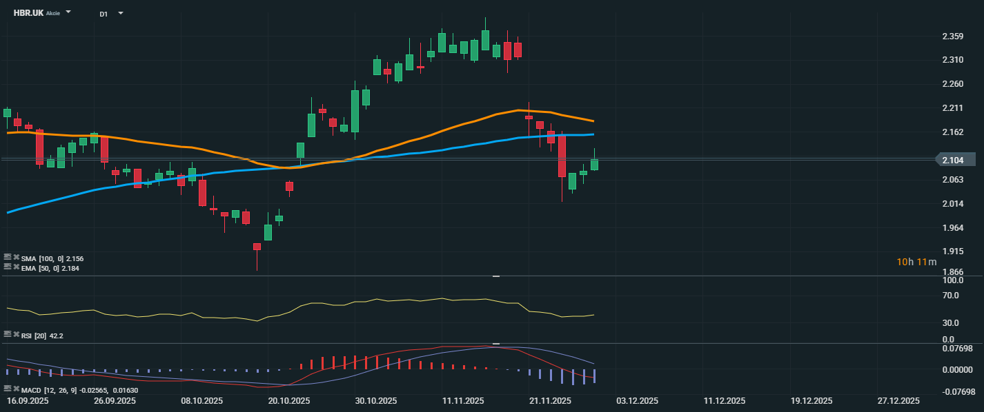 Akcie společnosti Harbour Energy aktuálně obchodují na úrovni 2,104 GBP, a i když se v posledních dnech pokusily o mírné zotavení, zůstávají pod důležitými technickými úrovněmi. Krátkodobý klouzavý průměr EMA 50 se nachází na hodnotě 2,184 GBP a SMA 100 na úrovni 2,156 GBP – obě hodnoty jsou nad aktuální cenou, což značí pokračující medvědí nastavení. RSI se nachází na hodnotě 42,2, což znamená, že trh není přeprodaný, ale nachází se v pásmu slabosti.