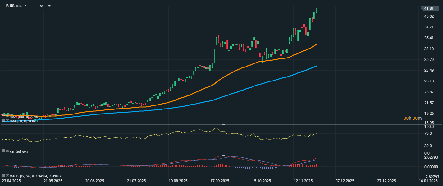 Akcie společnosti Barrick Gold Corp. dosáhly nové lokální úrovně na 41,81 USD, což představuje výrazný růstový trend, který trvá již několik měsíců. Z technického pohledu je trend jasně býčí – akcie se nachází výrazně nad klouzavými průměry, a to jak nad EMA 50 (34,09 USD), tak nad SMA 100 (32,46 USD). Tyto hodnoty nyní slouží jako hlavní úrovně podpory v případě korekce. RSI se blíží hodnotě 70 (konkrétně 69,7), což značí blízkost překoupeného pásma, a může naznačovat možné krátkodobé zpomalení růstu.