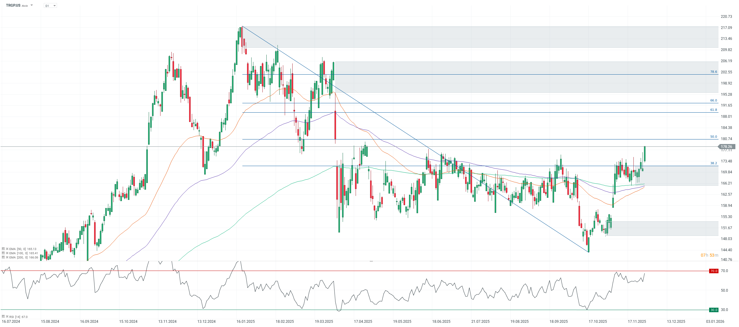 Akcie Target (TGT.US) vyskočily během dnešní seance o více než 2 % poté, co Wells Fargo zlepšila výhled akcií maloobchodního řetězce z "equal weight" na "overweight". Cílová cena byla bankou zvýšena ze 155 USD na 195 USD za akcii. Analytik Wells Fargo se domnívá, že by cena mohla vyskočit až o 20 % díky těmto faktorům: