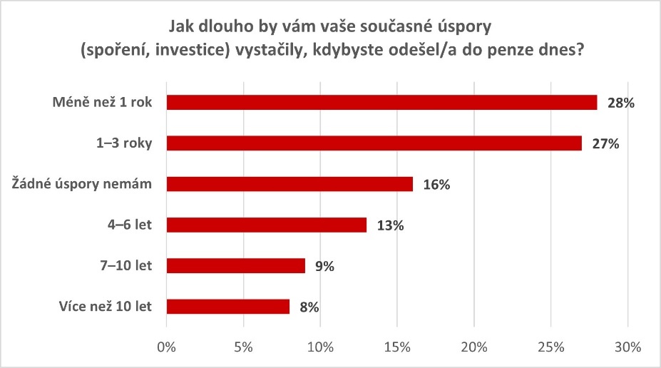 Když se Čechů zeptáme, jak dlouho by jim vystačily jejich současné úspory, kdyby odešli do penze dnes, začne se objevovat propast mezi představami a realitou. Největší část lidí — 28 % — má úspory jen na méně než jeden rok života v penzi. Dalších 27 % má úspory maximálně na tři roky. To znamená, že přibližně polovina populace je finančně připravena na pouhé 1–3 roky života bez příjmů ze zaměstnání.