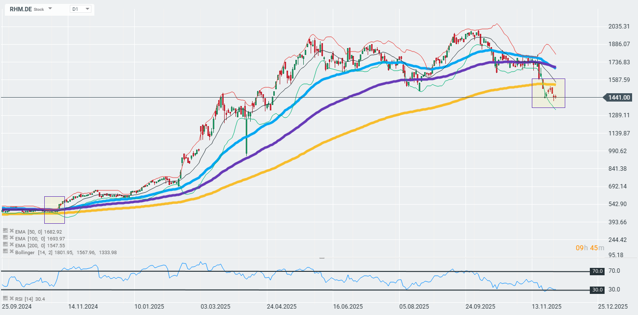 Akcie německého obranného giganta Rheinmetall (RHM.DE) dnes oslabují a zůstávají pod 200denním exponenciálním klouzavým průměrem (zlatá křivka v grafu). Zajímavé je, že tato technická úroveň nebyla trhem testována od listopadu 2024. Zdroj: xStation