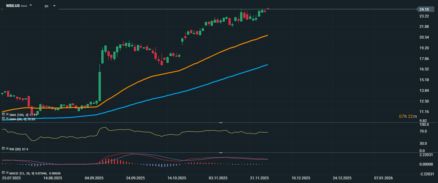 Akcie společnosti Warner Bros Discovery (WBD) se obchodují na úrovni 24,10 USD, čímž testují nové lokální maximum. Cena se stále nachází ve stabilním růstovém trendu, když se drží vysoko nad klouzavými průměry EMA 50 (20,83 USD) a SMA 100 (17,71 USD). Oba tyto průměry míří prudce vzhůru, což potvrzuje silné býčí momentum. RSI dosahuje hodnoty 67,4, tedy je těsně pod hranicí překoupenosti, což může naznačovat pokračující nákupní zájem, ale zároveň i mírné riziko blížící se korekce.