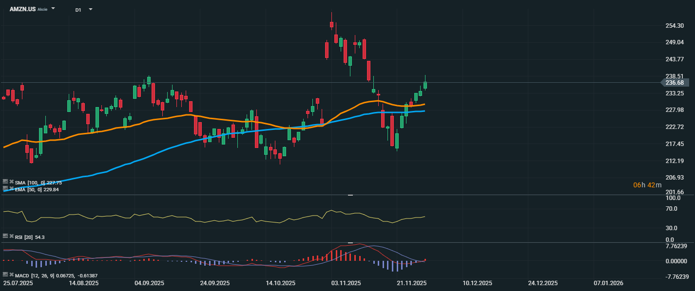 Akcie společnosti Amazon aktuálně posilují a obchodují se na ceně 236,68 USD, přičemž během posledních seancí došlo k jasnému proražení nad klouzavé průměry – EMA 50 (229,84 USD) i SMA 100 (227,75 USD). Tento průraz je pozitivní technický signál a může naznačovat obrat trendu směrem vzhůru. RSI se pohybuje na hodnotě 54,3, což znamená, že akcie mají prostor pro další růst bez známek překoupenosti.