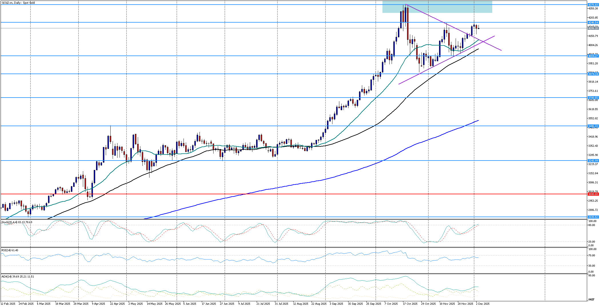 Po čtyřech měsících nepřetržitého růstu, během kterých zlato rychle odmazalo slabost z konce října, začal aktuální měsíc spíše smíšeně. Průlom ze symetrického trojúhelníku nenaplnil očekávání trhu, přestože se ceně podařilo vytvořit vyšší maximum – obvykle spolehlivý signál pokračujícího vzestupného trendu. Tento trend trvá od 28. října, kdy zlato kleslo na 3 886 USD, a je nadále podporován kombinací makroekonomických a tržních faktorů. Klíčovým hybatelem zůstává prudký nárůst očekávání ohledně prosincového snížení sazeb Fedu. Pravděpodobnost tohoto kroku se zvýšila z 25 % (19. listopadu) na současných 87 %, přičemž omezené inflační údaje z USA tento scénář dále posilují. Současně růst zlata podpořila averze k riziku vyvolaná propadem kryptoměn, zejména bitcoinu, pokračující slabost dolaru a optimistické odhady hlavních investičních společností týkající se výkonnosti zlata v roce 2026 – byť tyto odhady nepředpokládají opakování letošního mimořádného 60% růstu. Technické indikátory potvrzují přetrvávající býčí momentum. Nejbližší zásadní rezistencí je historické maximum 4 381 USD. Pokud býci udrží kontrolu, mohl by se trh posunout k úrovni 4 500 USD, což odpovídá střední hodnotě konsenzuálních predikcí pro rok 2026. Zajímavé je, že zlato téměř nereaguje na geopolitický vývoj kolem jednání mezi Ruskem a Ukrajinou – investoři tak zřejmě předpokládají jejich nízkou šanci na úspěch. Na druhé straně, pokud se obnoví chuť k riziku nebo se oslabí očekávání snížení sazeb, může dojít k poklesu směrem k 4 113 USD. Průraz pod spodní hranu trojúhelníku a trendovou linii z 5. srpna by pravděpodobně narazil na podporu u 50denního SMA kolem 4 009 USD.