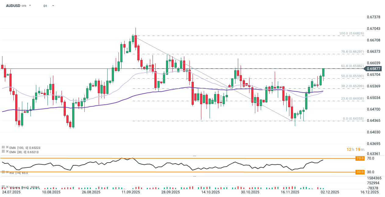 - Australský dolar získal také další podporu díky vyššímu než očekávanému výsledku indexu služeb PMI v Číně: 52,1 vs. očekávání 52. Sektor služeb v listopadu expandoval, i když růst mírně zpomalil (předchozí: 52,6). Nové objednávky a exportní poptávka se zlepšily, podpořeny zklidněním napětí v obchodních vztazích USA–Čína. Zaměstnanost však dál klesala a ziskové marže zůstaly pod tlakem. Vstupní náklady rostly devátý měsíc v řadě, přičemž očekávání firem ohledně budoucí aktivity oslabila, což poukazuje na přetrvávající výzvy.