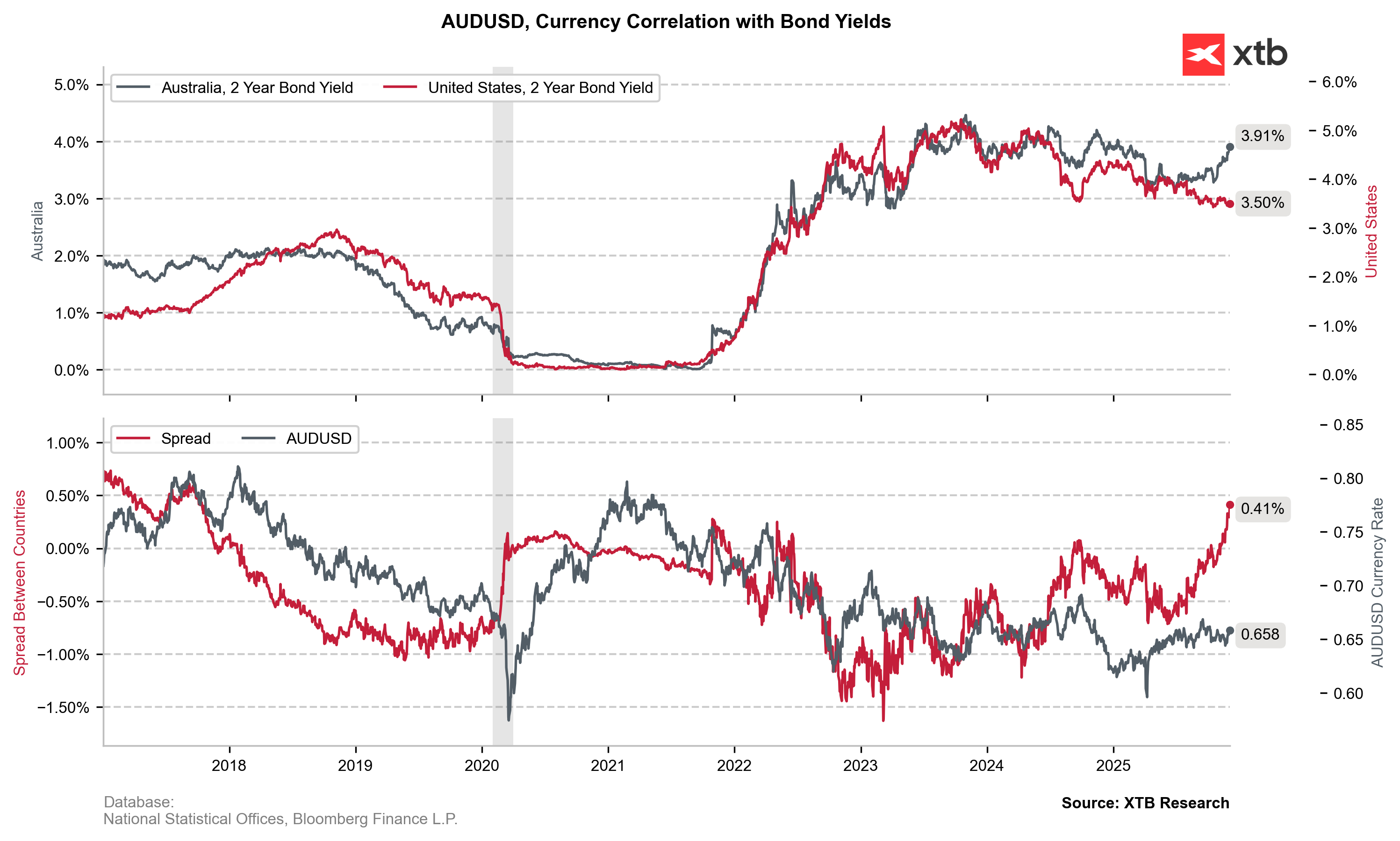 - Rozdíl mezi 2letými australskými a americkými vládními dluhopisy dosáhl nejvyšší úrovně od konce roku 2017. Měnová politika USA odráží jak krátkodobé očekávání uvolňování, tak holubičí dlouhodobý výhled, ovlivněný očekávaným nástupcem Jeroma Powella, kterého má prezident Trump oznámit začátkem roku 2026. V noci Trump označil svého hlavního ekonomického poradce Kevina Hassetta za „potenciálního šéfa Fedu“. Trhy vnímají Hassetta jako silně pro-snižování sazeb orientovaného kandidáta – mezi uchazeči převažují současní či bývalí představitelé Fedu.